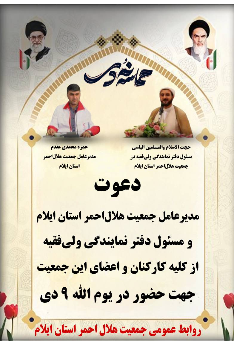 حمزه محمدی‌مقدم مدیرعامل جمعیت هلال‌احمر استان ایلام و حجت‌الاسلام‌والمسلمین محسن رستمی، مسئول دفتر نمایندگی ولی‌فقیه در این جمعیت، در پیامی مشترک از کلیه کارکنان، داوطلبان، امدادگران و جوانان عضو جمعیت هلال‌احمر استان برای حضور گسترده و باشکوه در مراسم یوم‌الله ۹ دی دعوت به عمل آوردند.