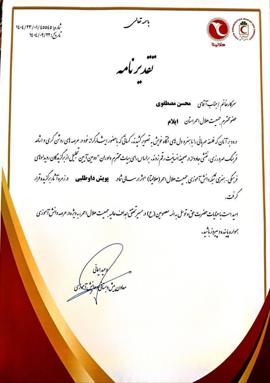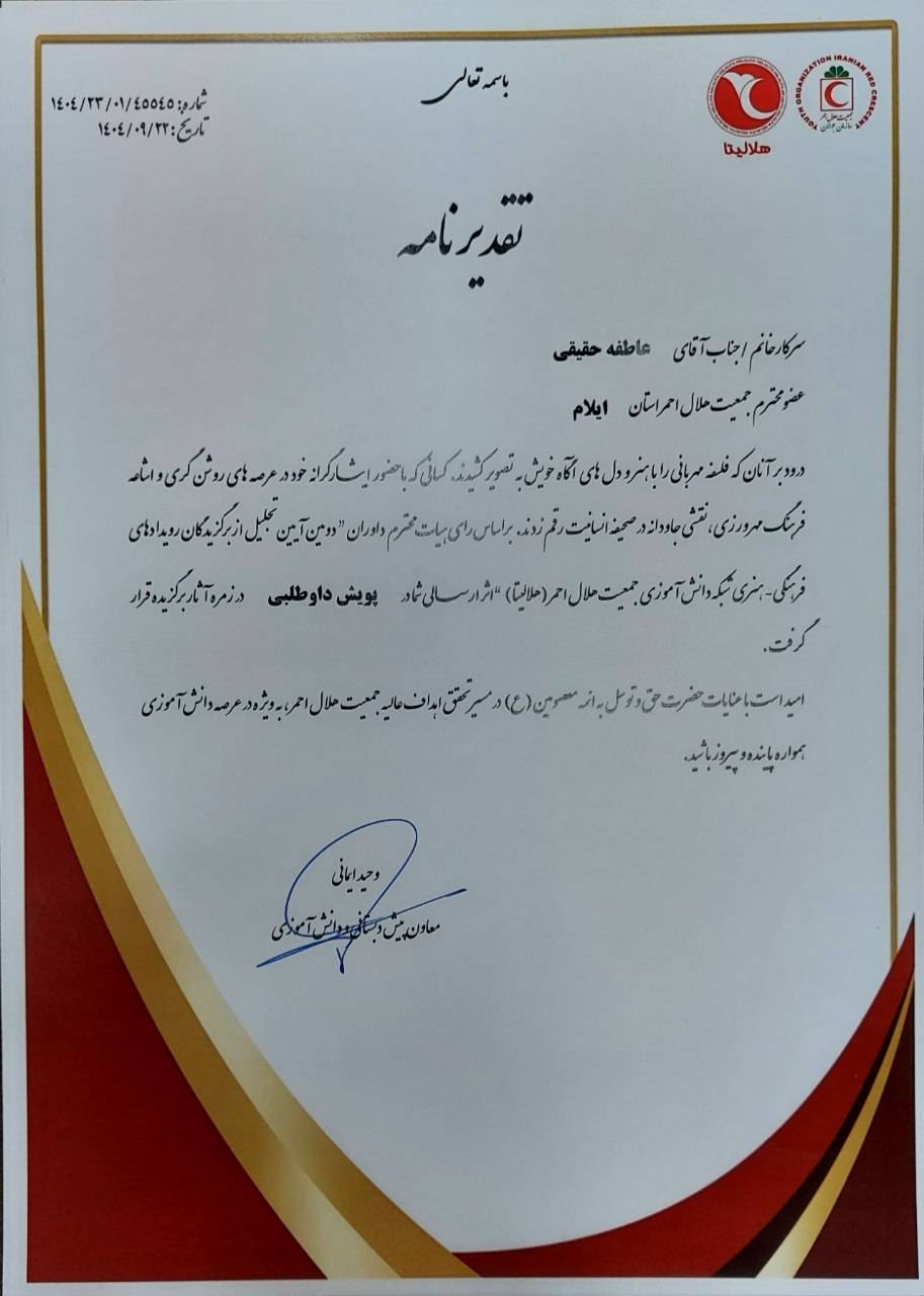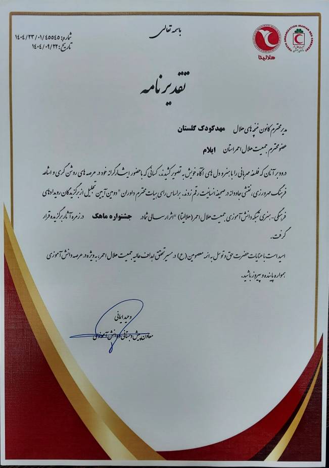 محمدی‌مقدم، افزود : این موفقیت‌ها نتیجه تلاش خالصانه و استمرار برنامه‌های فرهنگی، آموزشی و داوطلبانه در حوزه دانش‌آموزی جمعیت هلال‌احمر ایلام است.