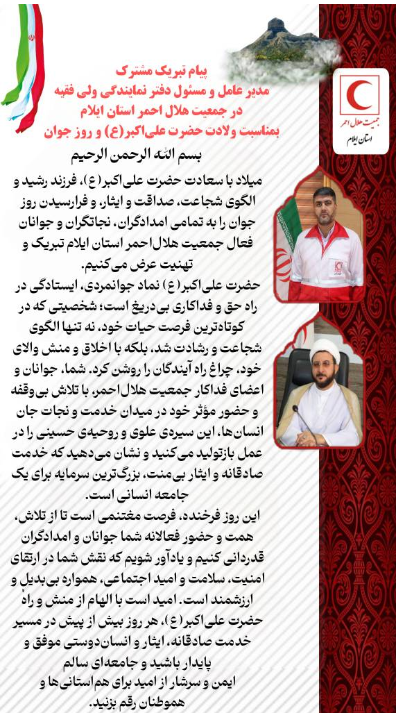 این روز فرخنده، فرصت مغتنمی است تا از تلاش، همت و حضور فعالانه شما جوانان و امدادگران قدردانی کنیم و یادآور شویم که نقش شما در ارتقای امنیت، سلامت و امید اجتماعی، همواره بیبدیل و ارزشمند است. امید است با الهام از منش و راه حضرت علیاکبر(ع)، هر روز بیش از پیش در مسیر خدمت صادقانه، ایثار و انساندوستی موفق و پایدار باشید و جامعهای سالم، ایمن و سرشار از امید برای هماستانیها و هموطنان رقم بزنید.